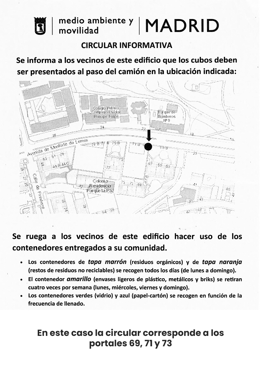 Ya en su día el Ayuntamiento informo a cada comunidad la zona que le correspondía, les adjunto el escrito recibido para el bloque de los portales 69, 71 y 73.